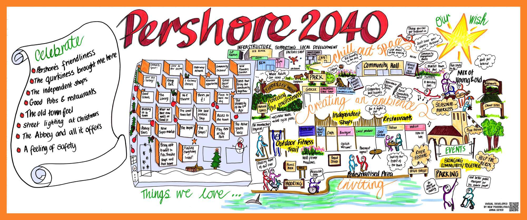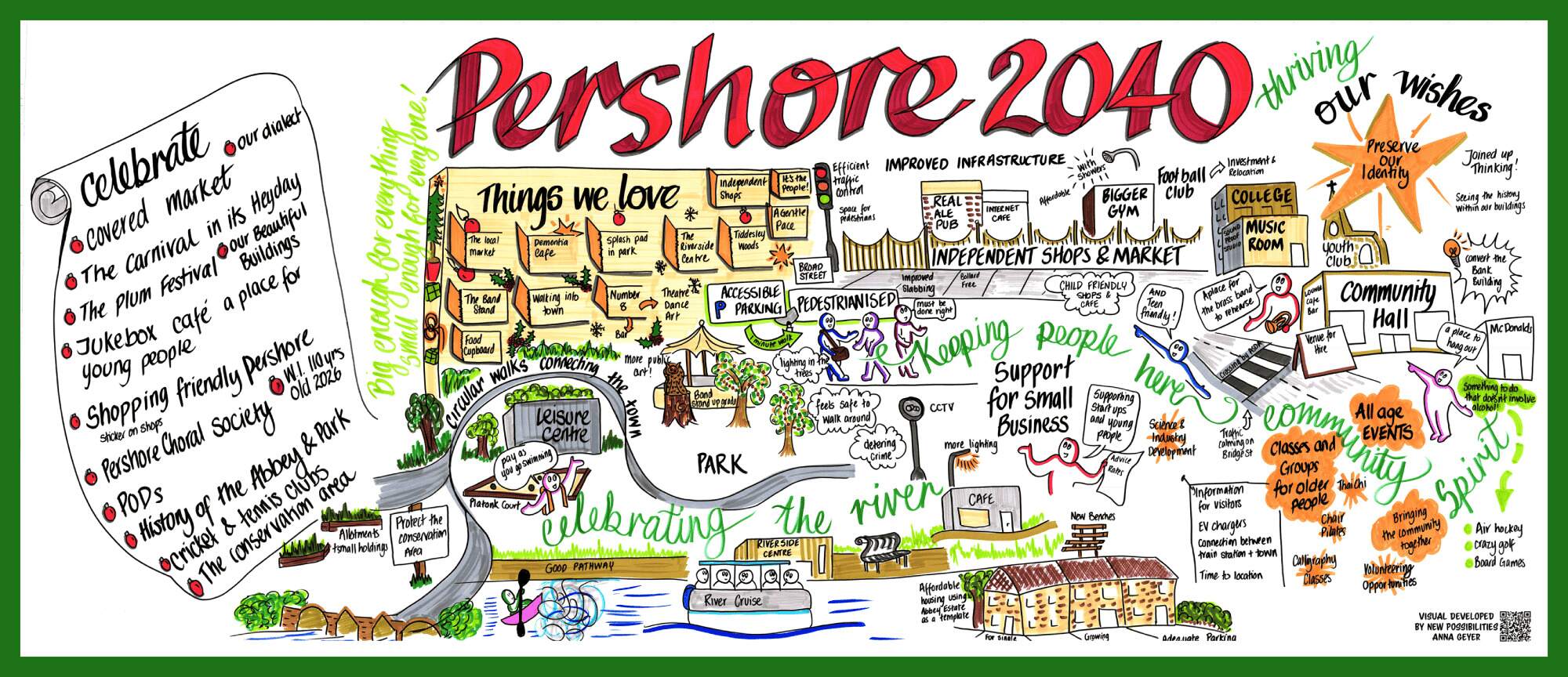 The mural project was originally conceived by Branwen Bingle, Communities Officer at Wychavon District Council, whose vision was to gather community insight in an accessible, creative and engaging way. Its realisation was made possible through generous funding from the Elmley Foundation, to whom Pershore Civic Society extends heartfelt thanks. Their support enabled the Society to bring an innovative and interactive activity to the Fayre—one that celebrated both heritage and aspiration.